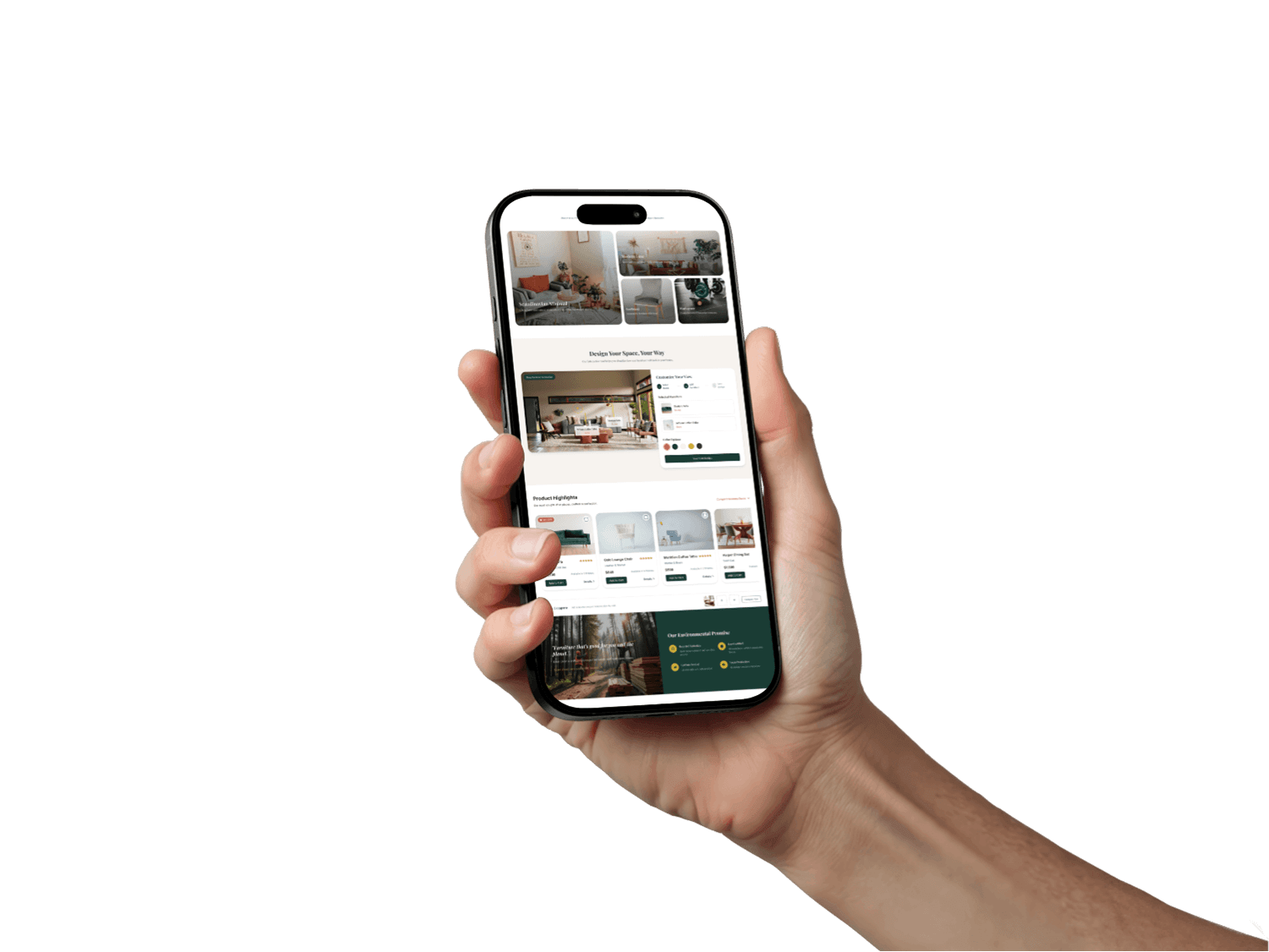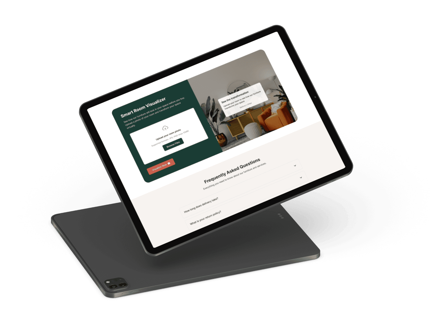 A modern, user-friendly landing page for a furniture seller designed to boost engagement and conversions with interactive features like AR room preview, quick compare drawer, and smart visualizer, while highlighting sustainability and trust.